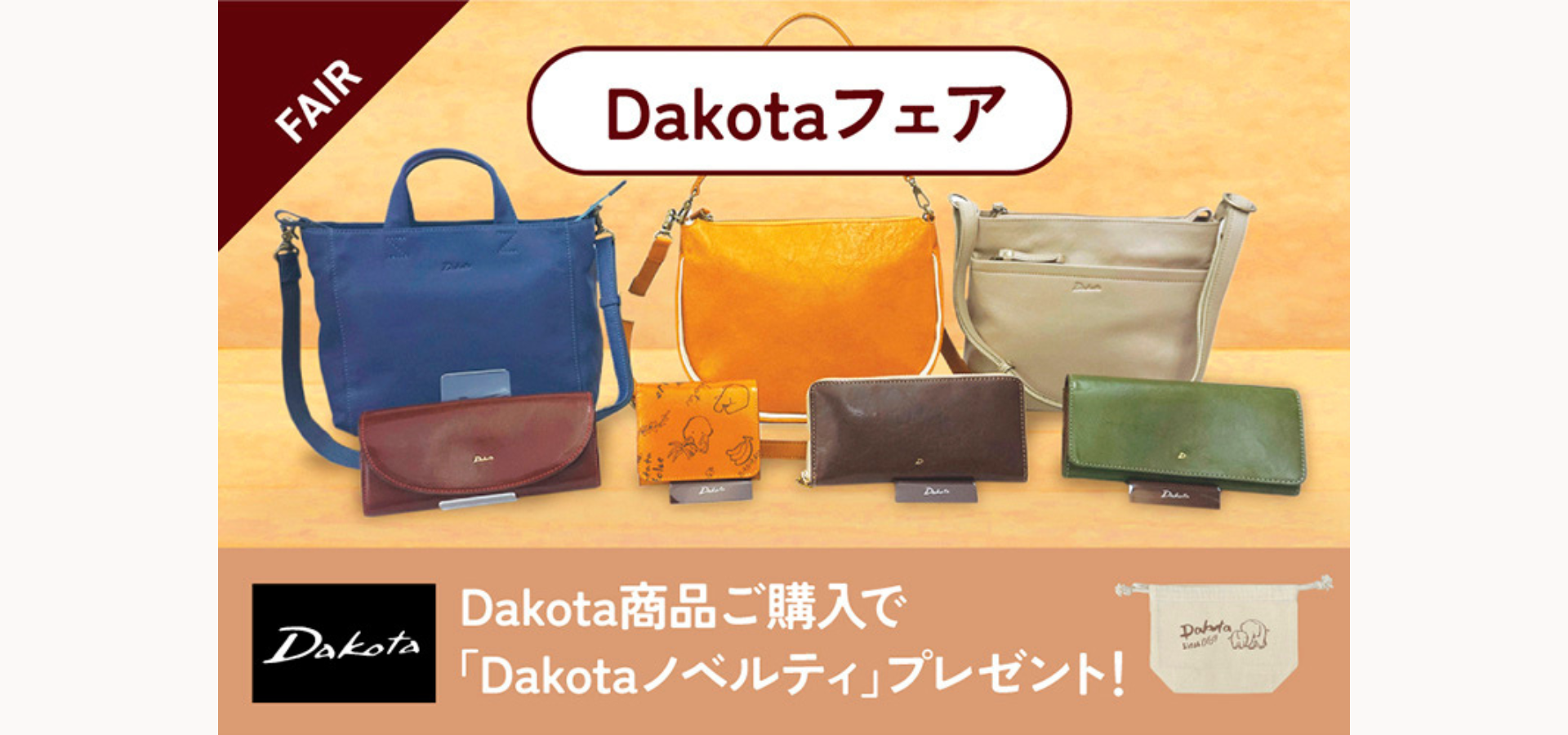 Dakotaフェア期間中は、Dakota商品をお買い上げいただいたお客様に、「Dakotaのオリジナルノベルティ」をプレゼントいたします。種類も様々ございますので、お選びいただけます。